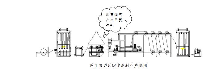 通過(guò)現(xiàn)場(chǎng)勘察和設(shè)計(jì)經(jīng)驗(yàn),現(xiàn)場(chǎng)煙氣及粉塵的來(lái)源主要有兩個(gè)部分,一是原料儲(chǔ)存及攪拌罐頂部排氣孔的無(wú)組織排放,二是防水卷材的浸涂、覆膜、撒砂、包裝工藝環(huán)節(jié)產(chǎn)生的高溫瀝青煙氣。